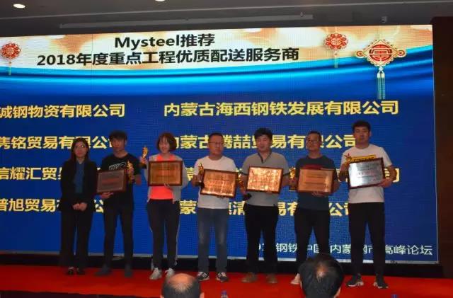 本次會議頒獎環(huán)節(jié),內(nèi)蒙古誠鋼物資有限公司先后獲得了“Mysteel推薦2018年度重點工程優(yōu)質(zhì)配送服務(wù)商”;“2018年度優(yōu)質(zhì)經(jīng)銷商”兩大獎項。