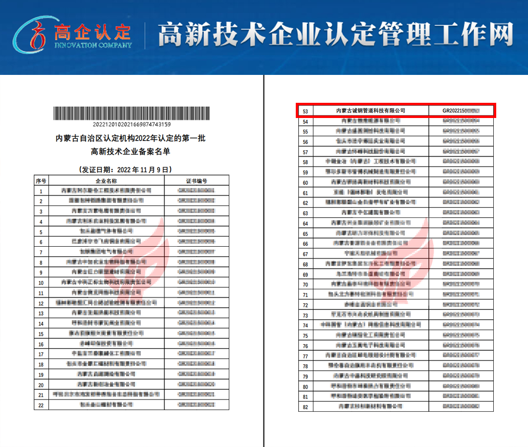 2022年12月1日,全國高新技術(shù)企業(yè)認(rèn)定管理工作領(lǐng)導(dǎo)小組辦公室對內(nèi)蒙古自治區(qū)認(rèn)定機(jī)構(gòu)2022年認(rèn)定的第一批202家高新技術(shù)企業(yè)進(jìn)行備案公示,內(nèi)蒙古誠鋼管道科技有限公司屬于內(nèi)蒙古自治區(qū)認(rèn)定機(jī)構(gòu) 2022 年認(rèn)定的高新技術(shù)企業(yè),將獲得《高新技術(shù)企業(yè)證書》。
